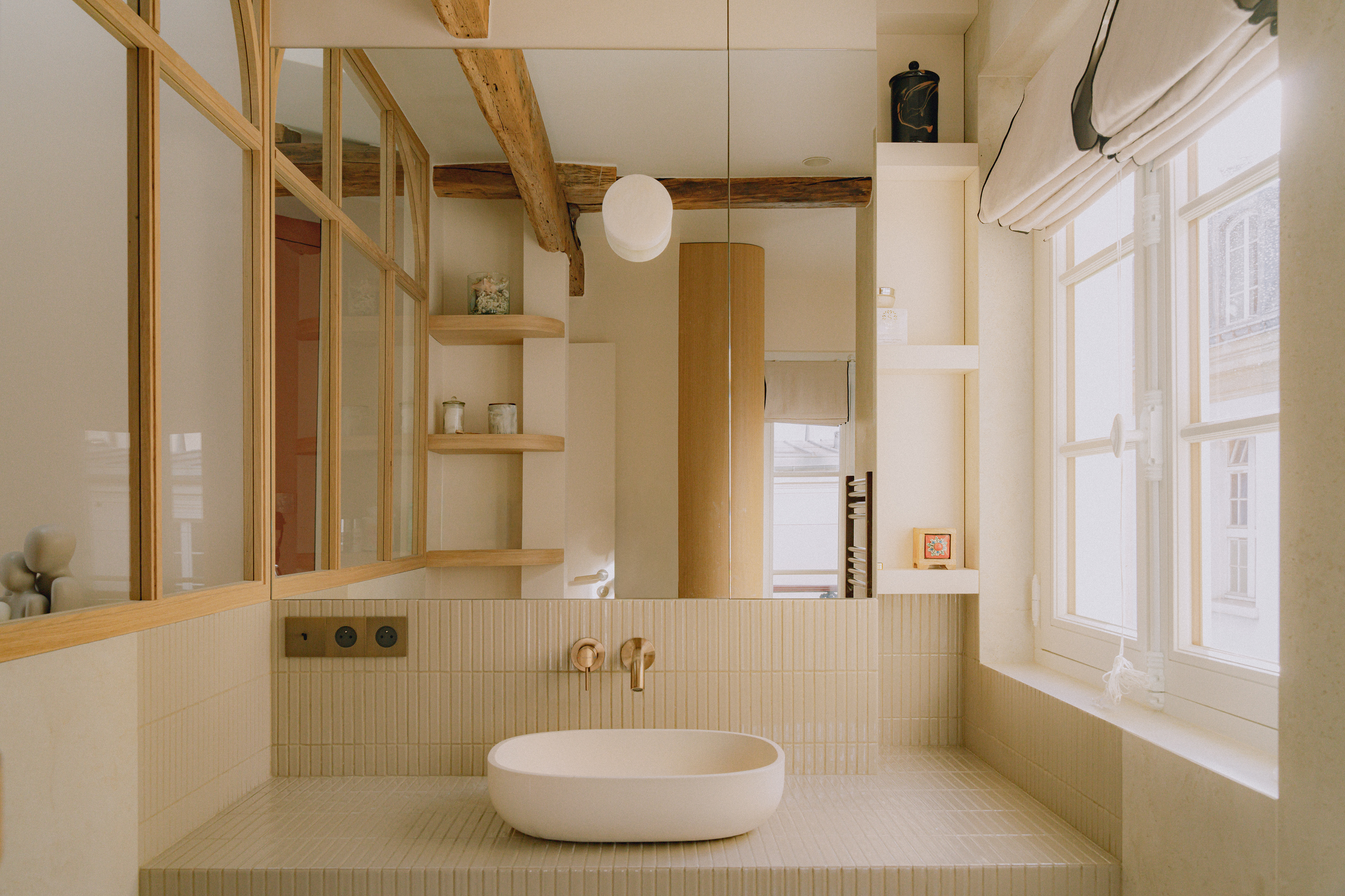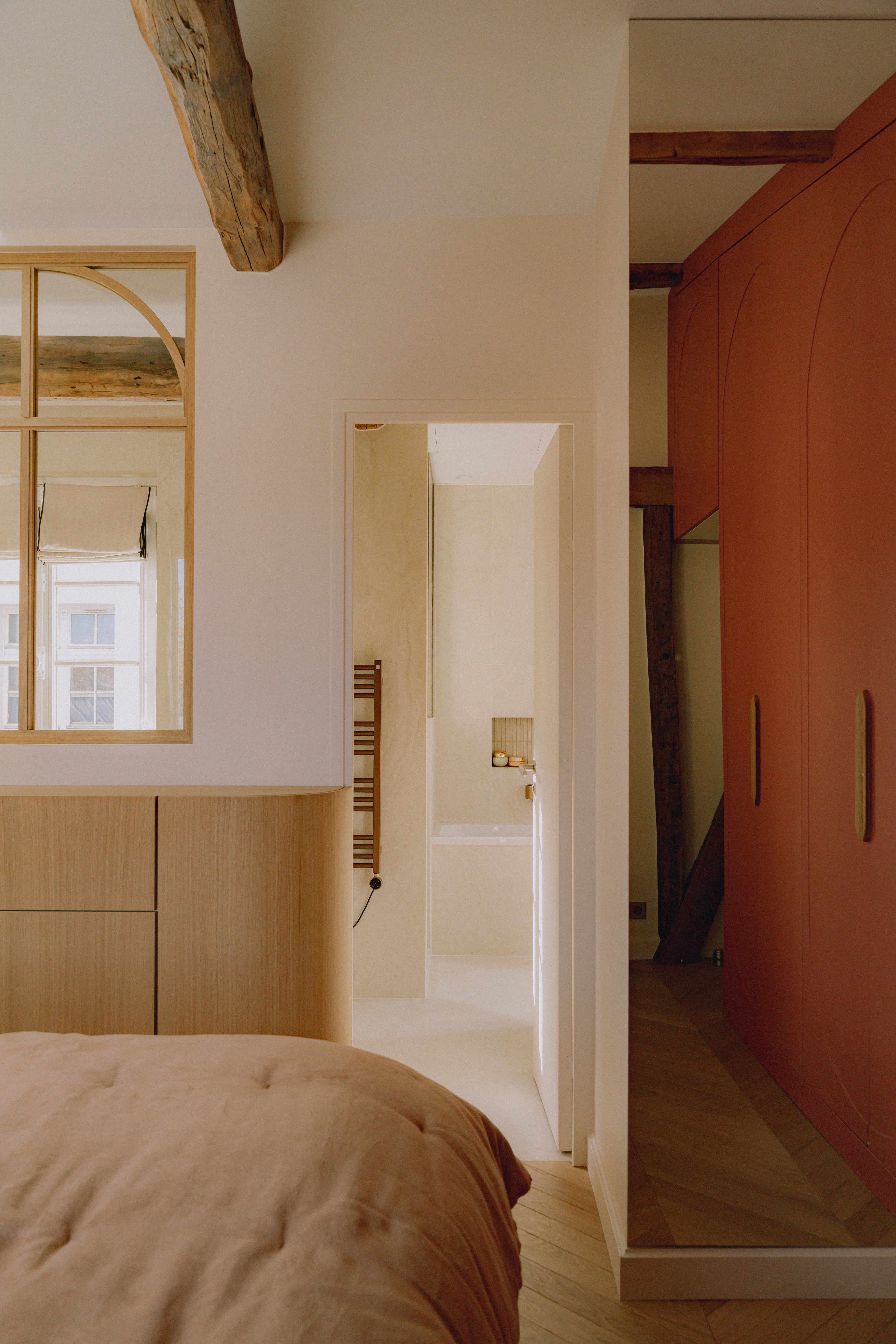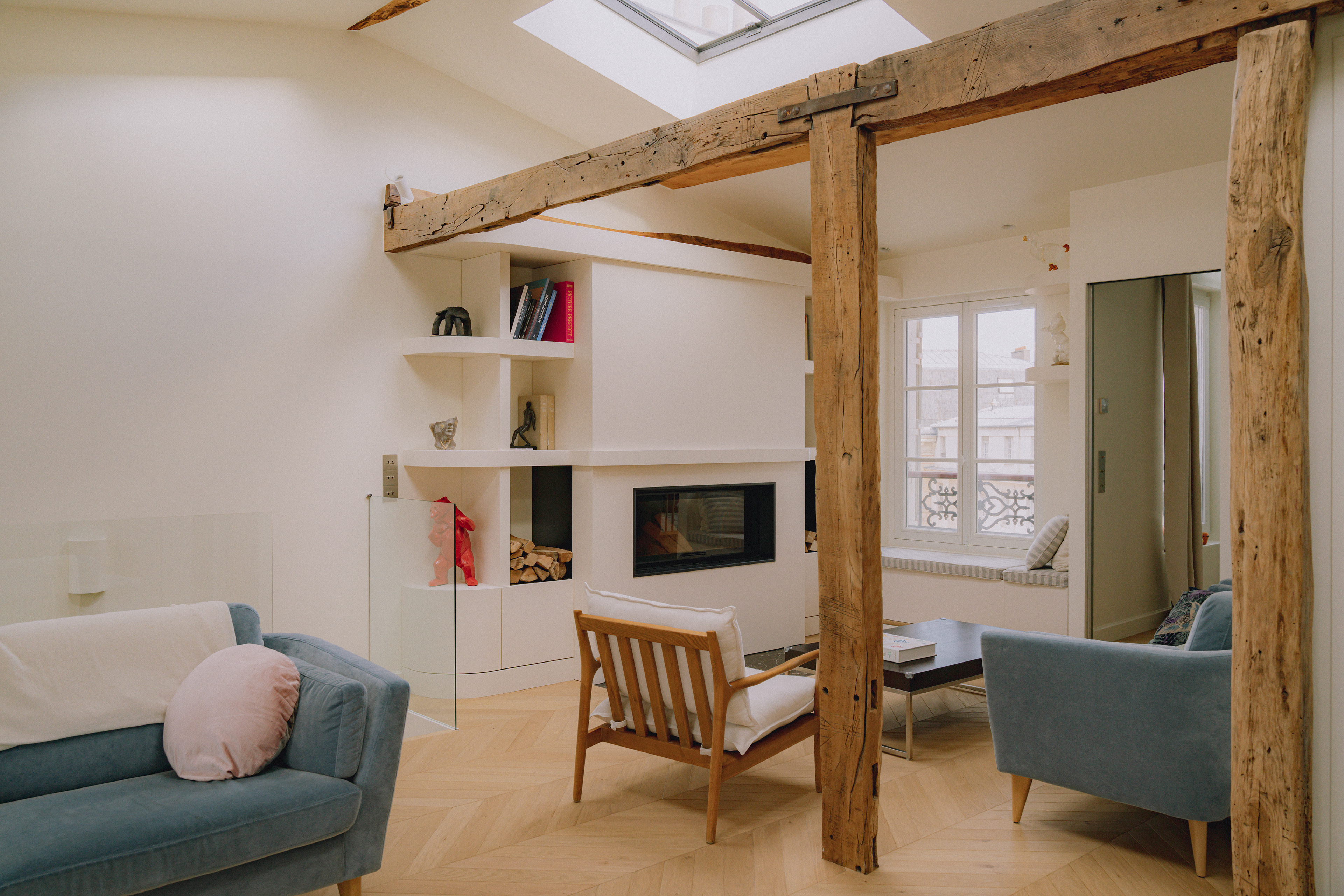 Grâce à sa quadruple orientation, l’appartement vit au rythme de la lumière. Dans la chambre parentale, une verrière intérieure ouvre la perspective entre chambre et salle de bain attenante, offrant une double exposition. Le séjour, quant à lui, s’ouvre vers le ciel avec quatre verrières de toit : dès la montée de l’escalier, la lumière enveloppe les volumes et magnifie l’espace.