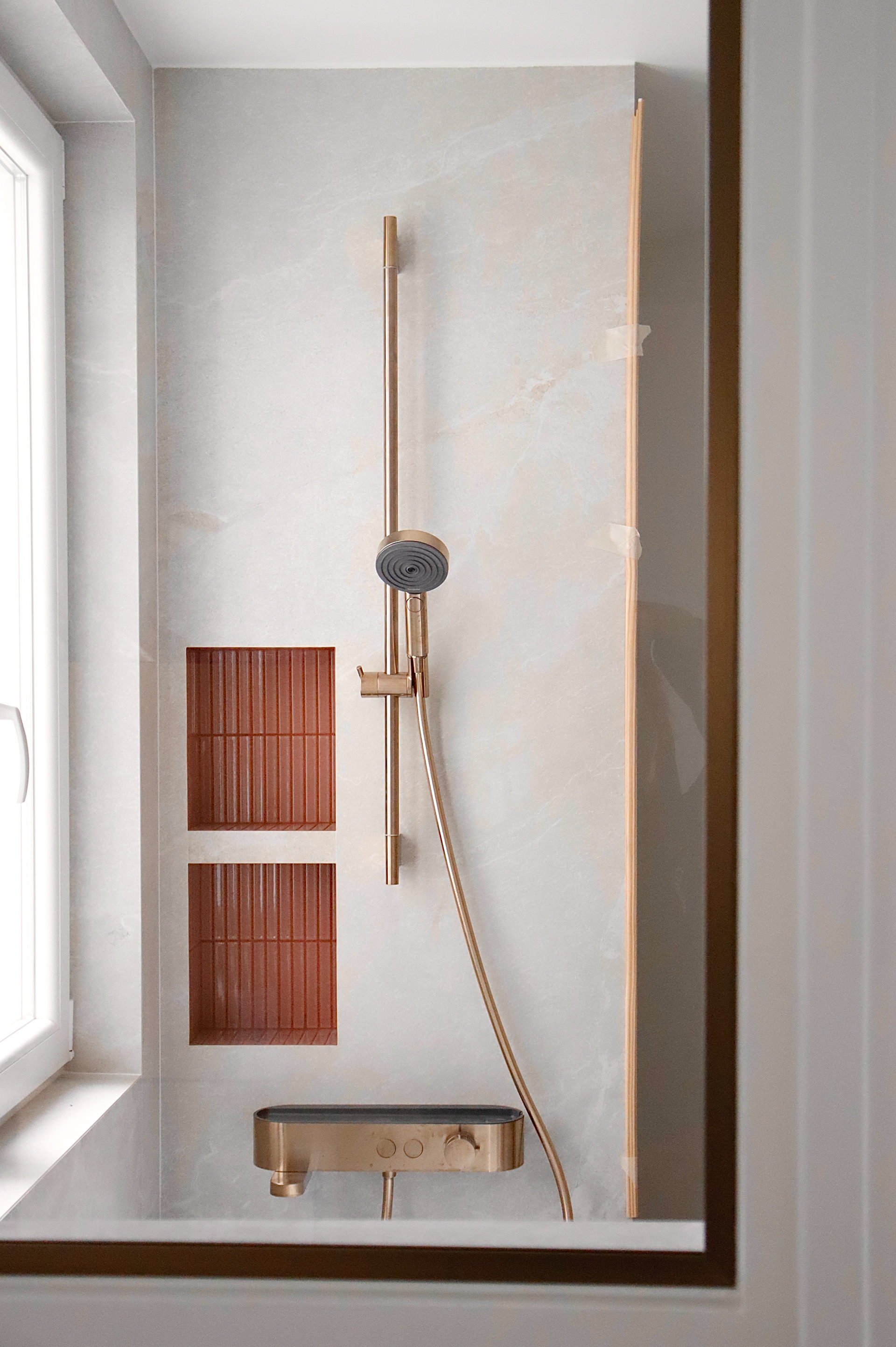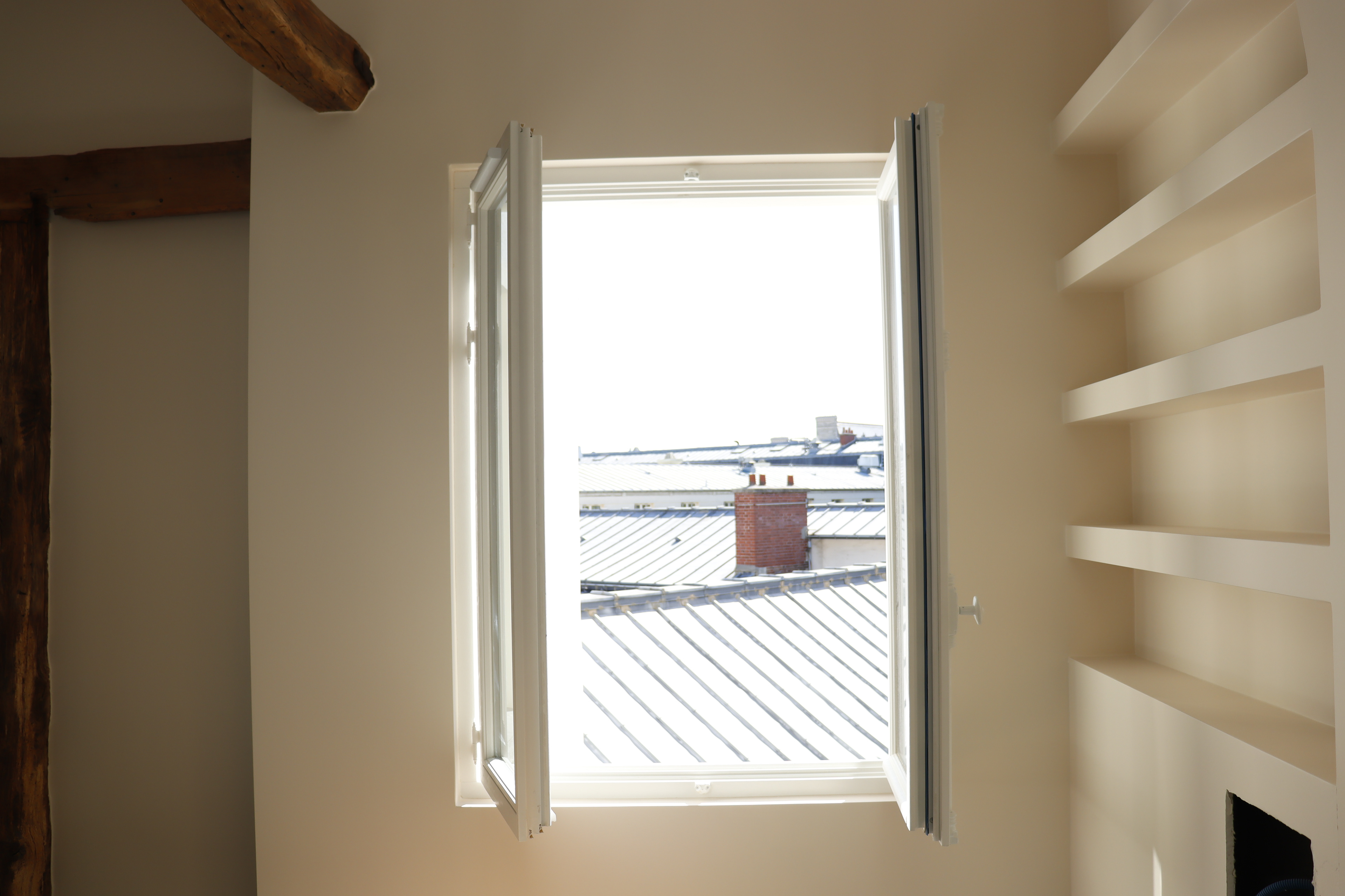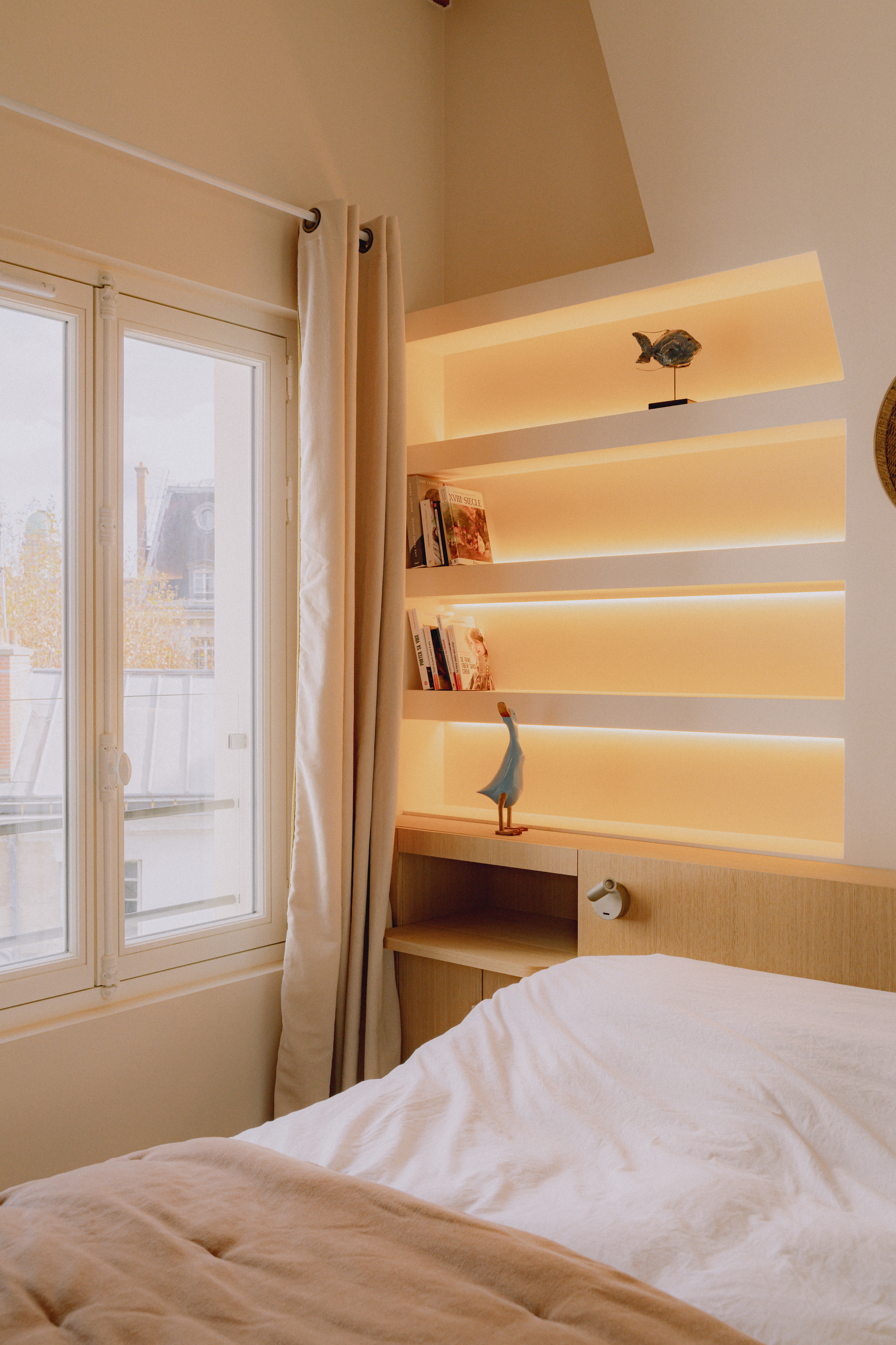 Grâce à sa quadruple orientation, l’appartement vit au rythme de la lumière. Dans la chambre parentale, une verrière intérieure ouvre la perspective entre chambre et salle de bain attenante, offrant une double exposition. Le séjour, quant à lui, s’ouvre vers le ciel avec quatre verrières de toit : dès la montée de l’escalier, la lumière enveloppe les volumes et magnifie l’espace.