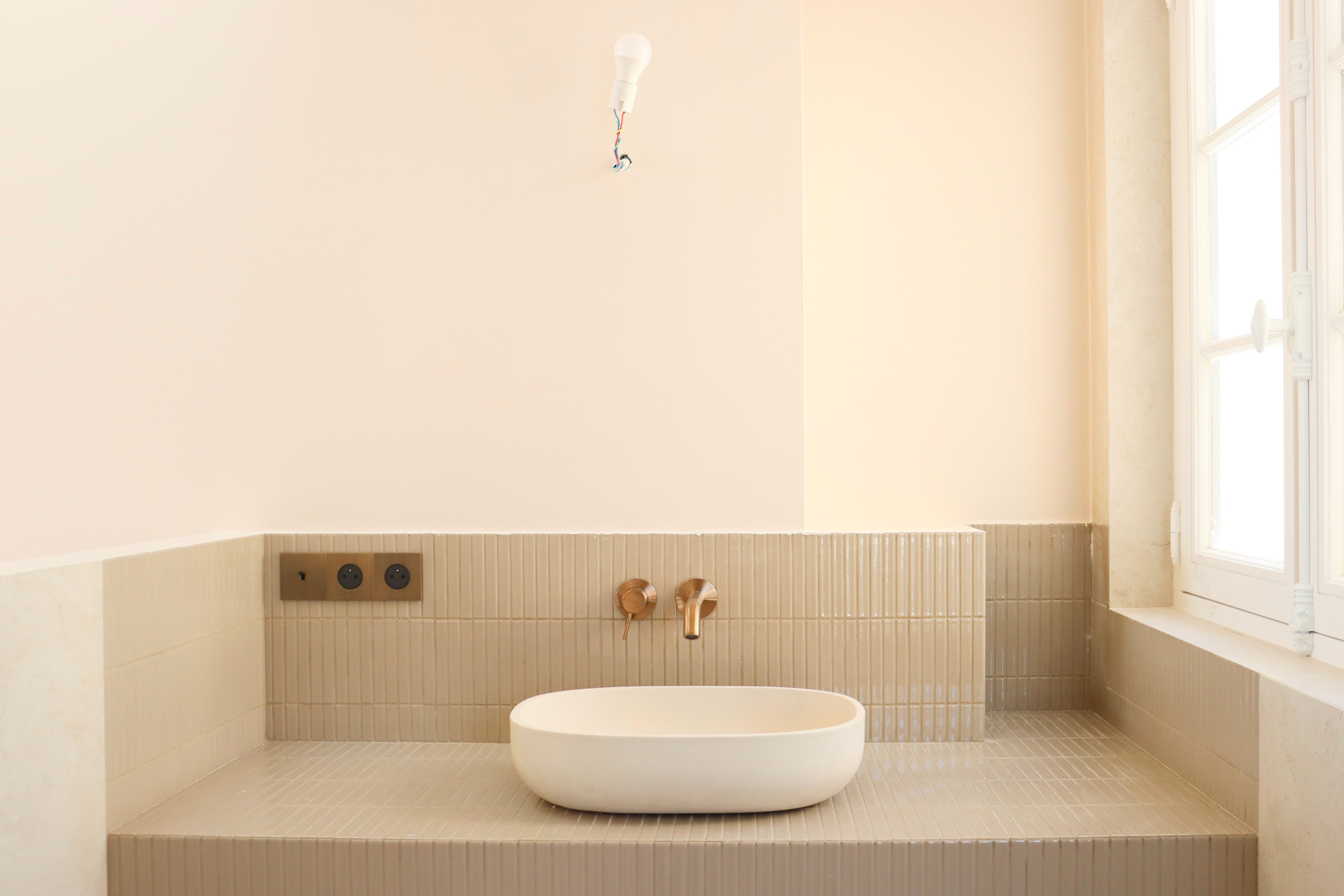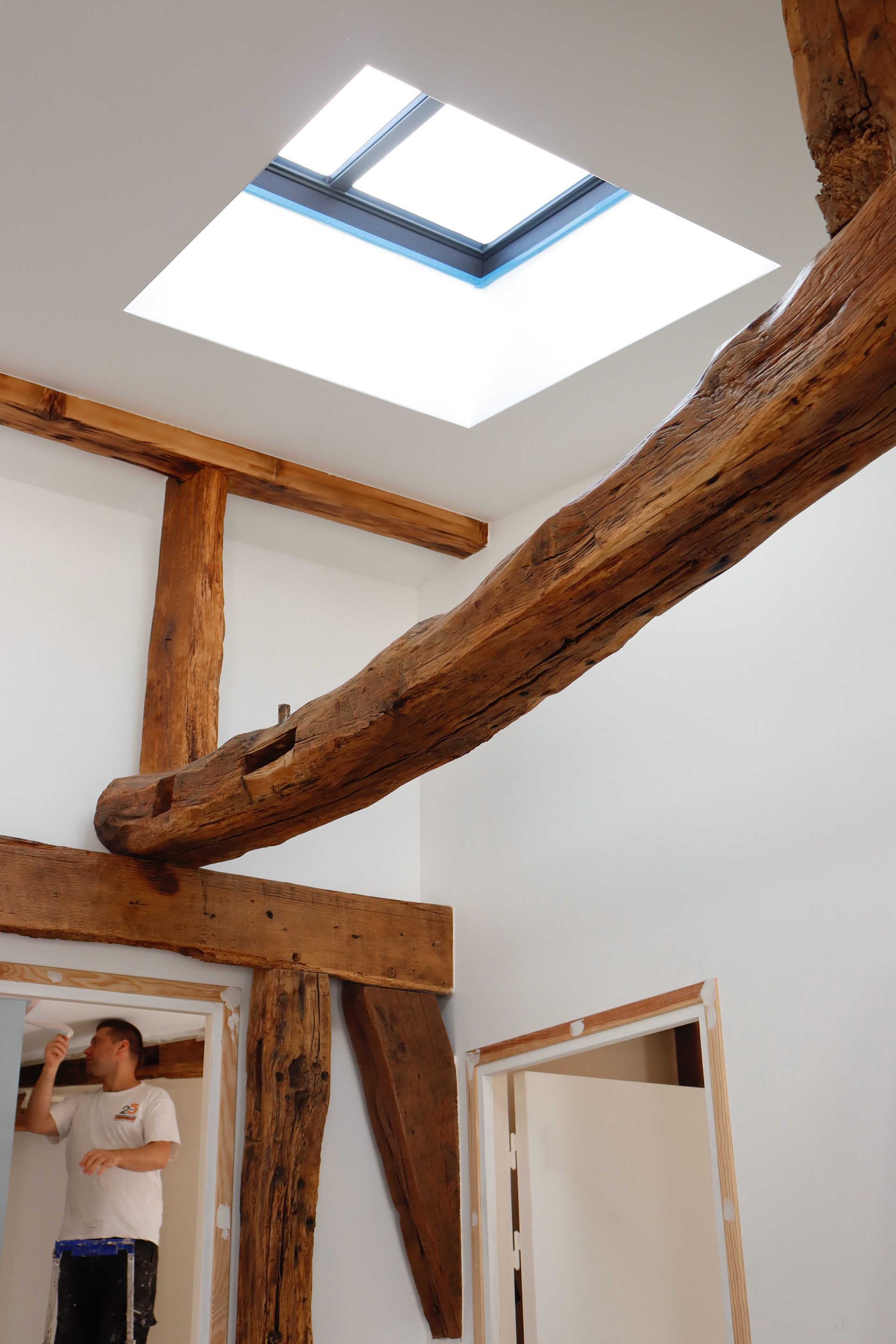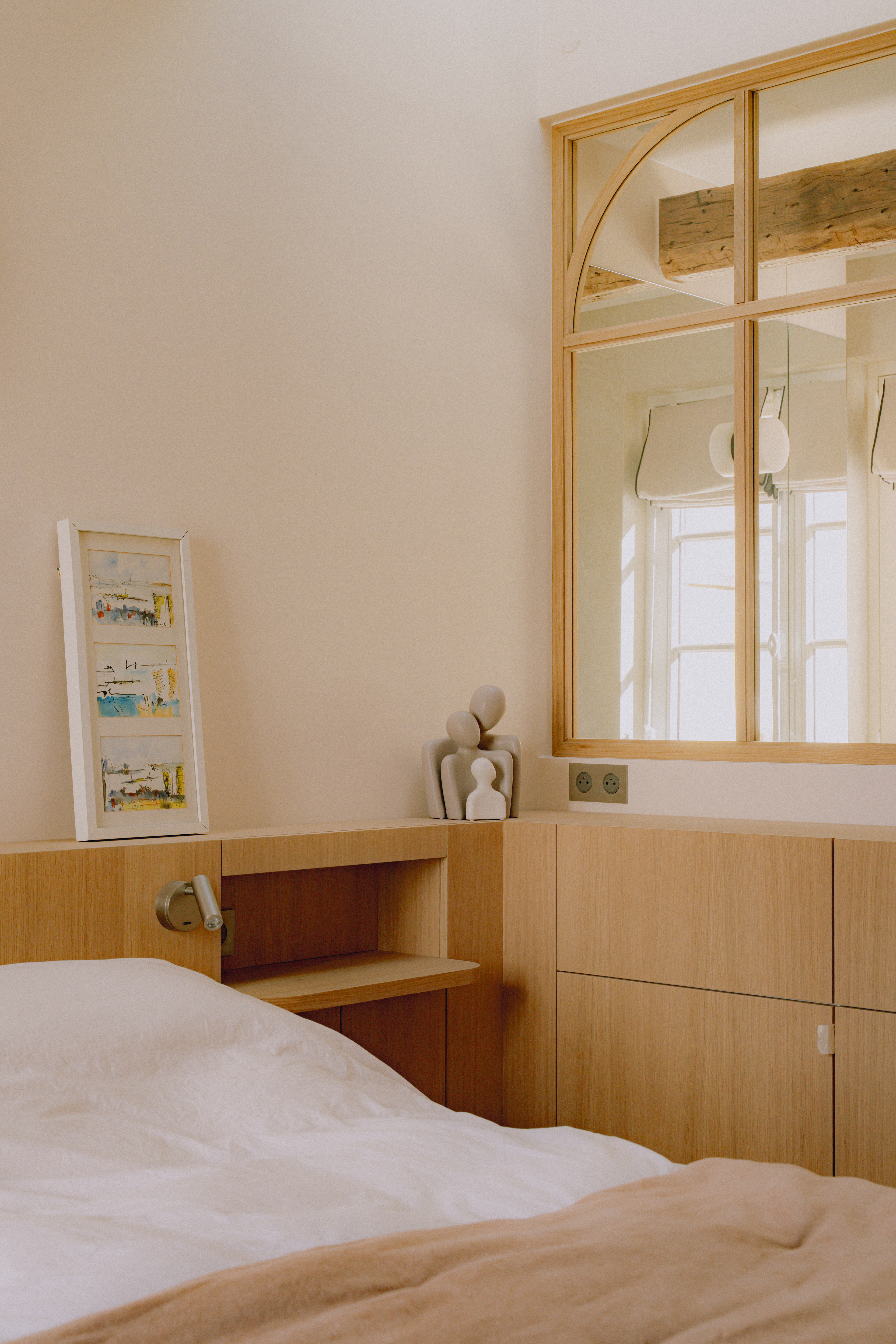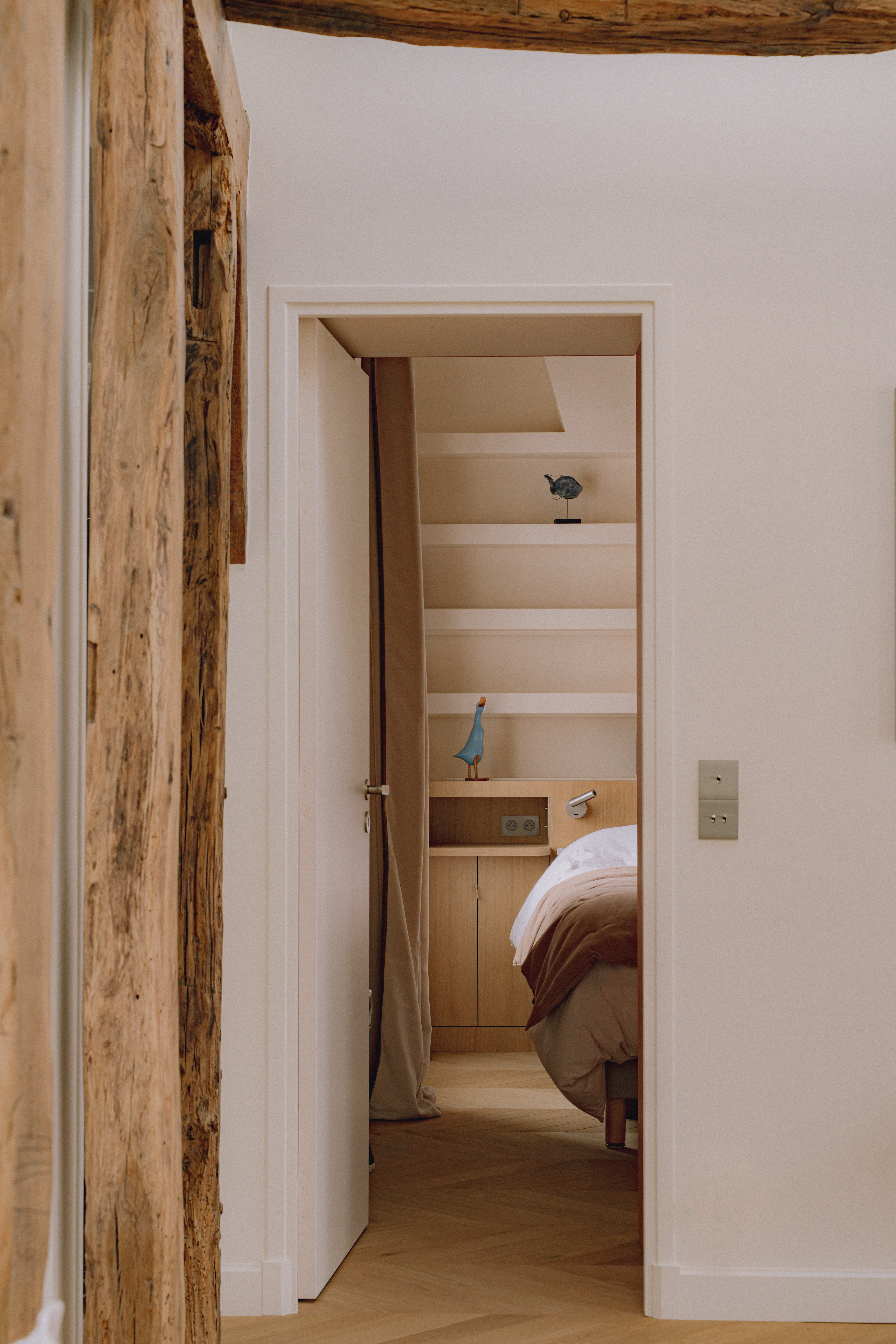 Pensé comme un cocon lumineux, ce projet conjugue modernité et charme de l’ancien. Les poutres apparentes et le parquet en point de Hongrie dialoguent avec des lignes contemporaines, créant un intérieur graphique et doux.