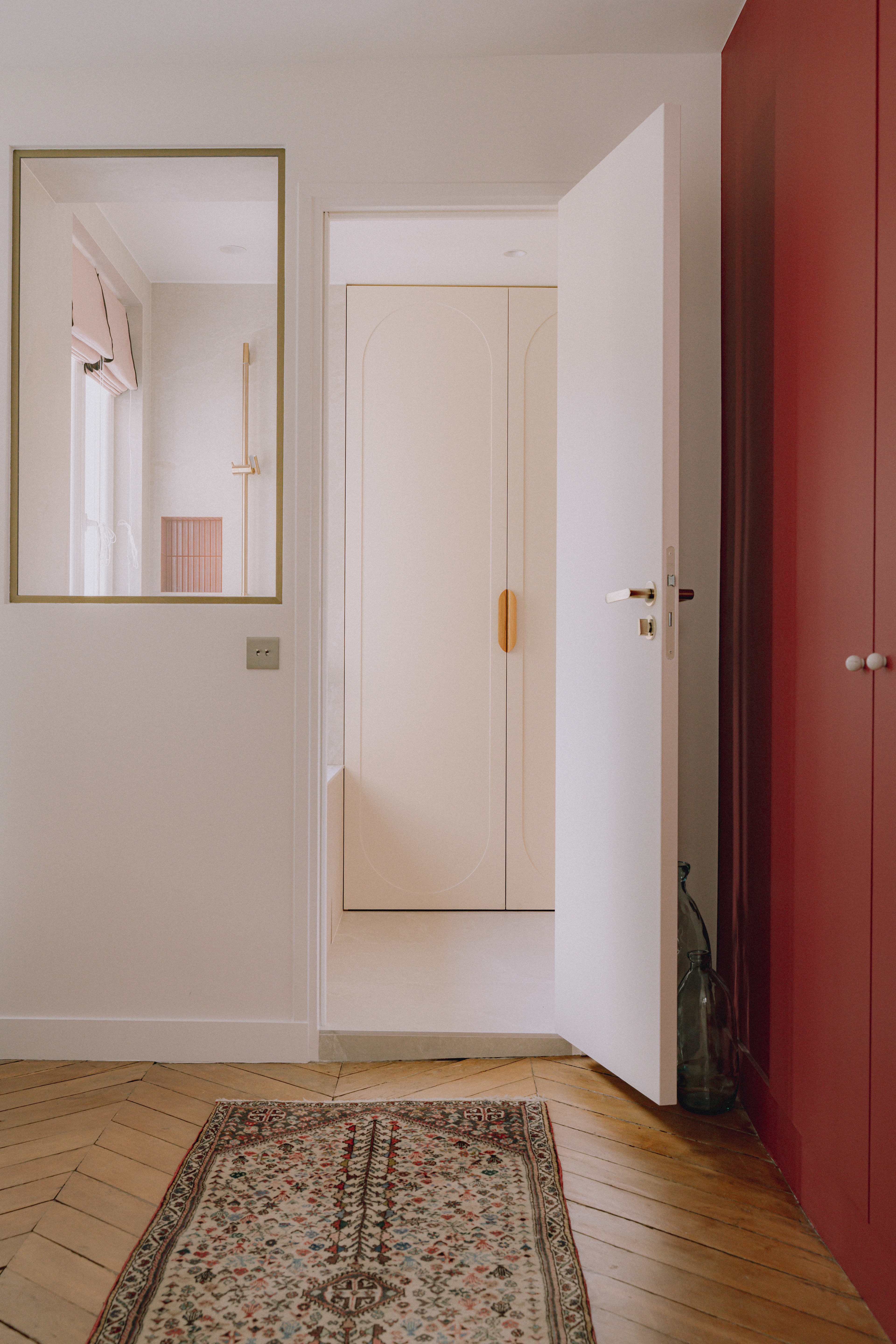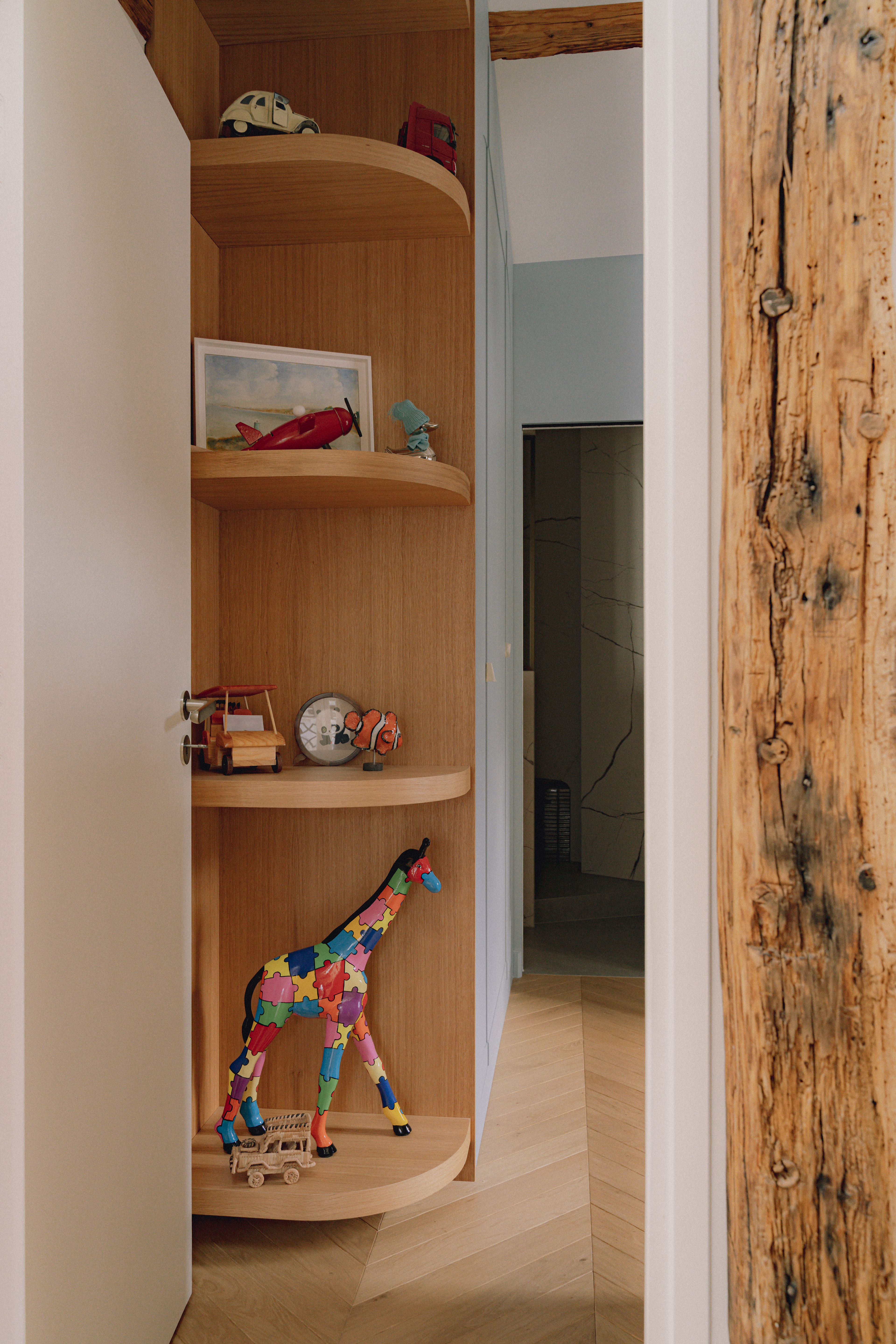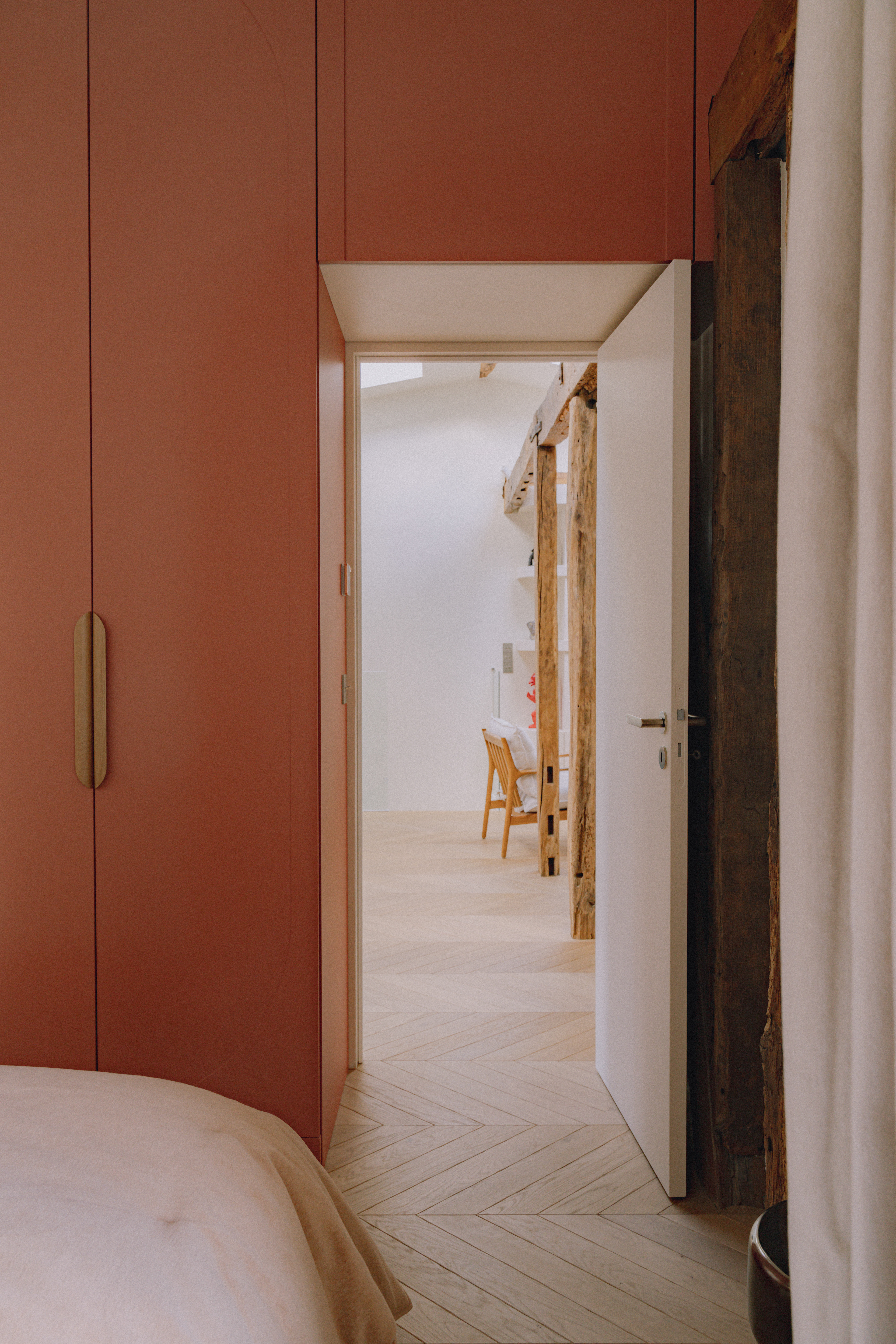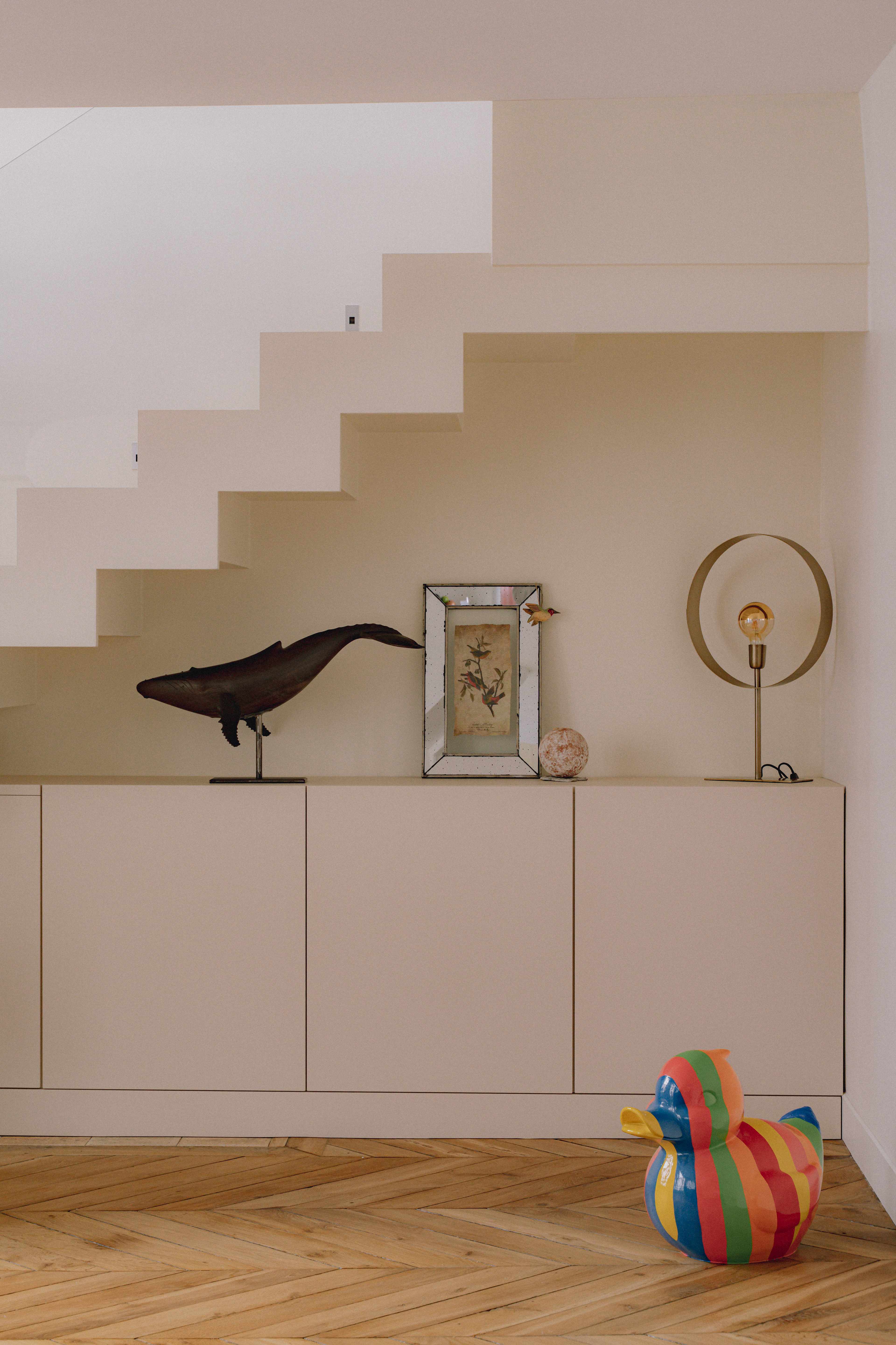 Le mobilier sur mesure, dessiné tout en courbes fluides, apporte douceur et mouvement, et dialogue avec des formes plus graphiques et symétriques comme celles de l’escalier ou des salles de bain. Les dressings toute hauteur, optimisés, prolongent cette recherche d’équilibre en renforçant la verticalité et en accentuant la générosité sous plafond.
