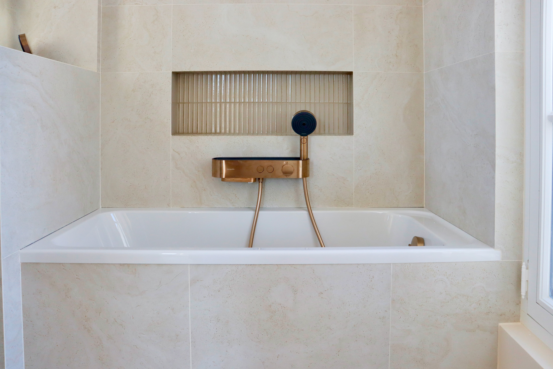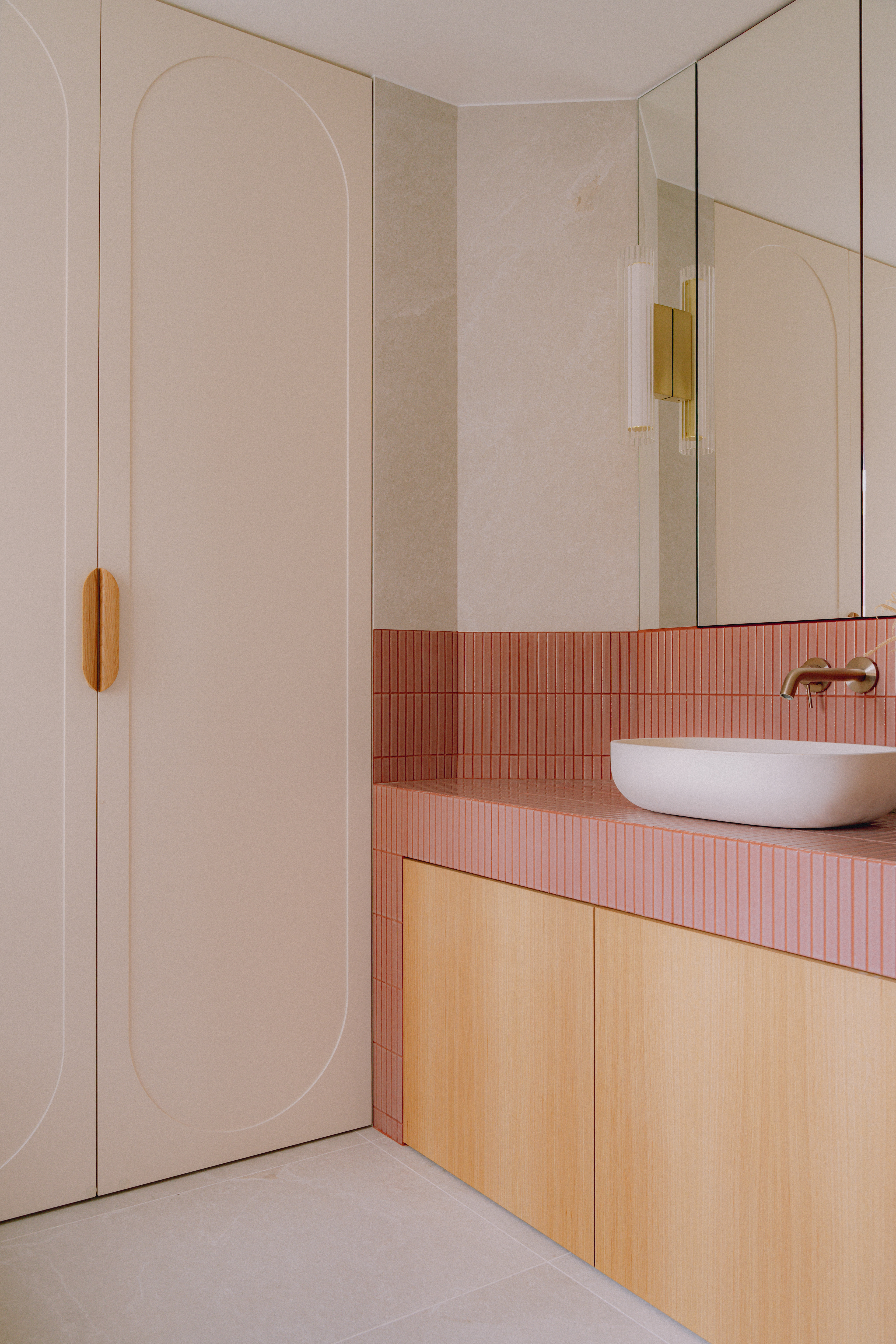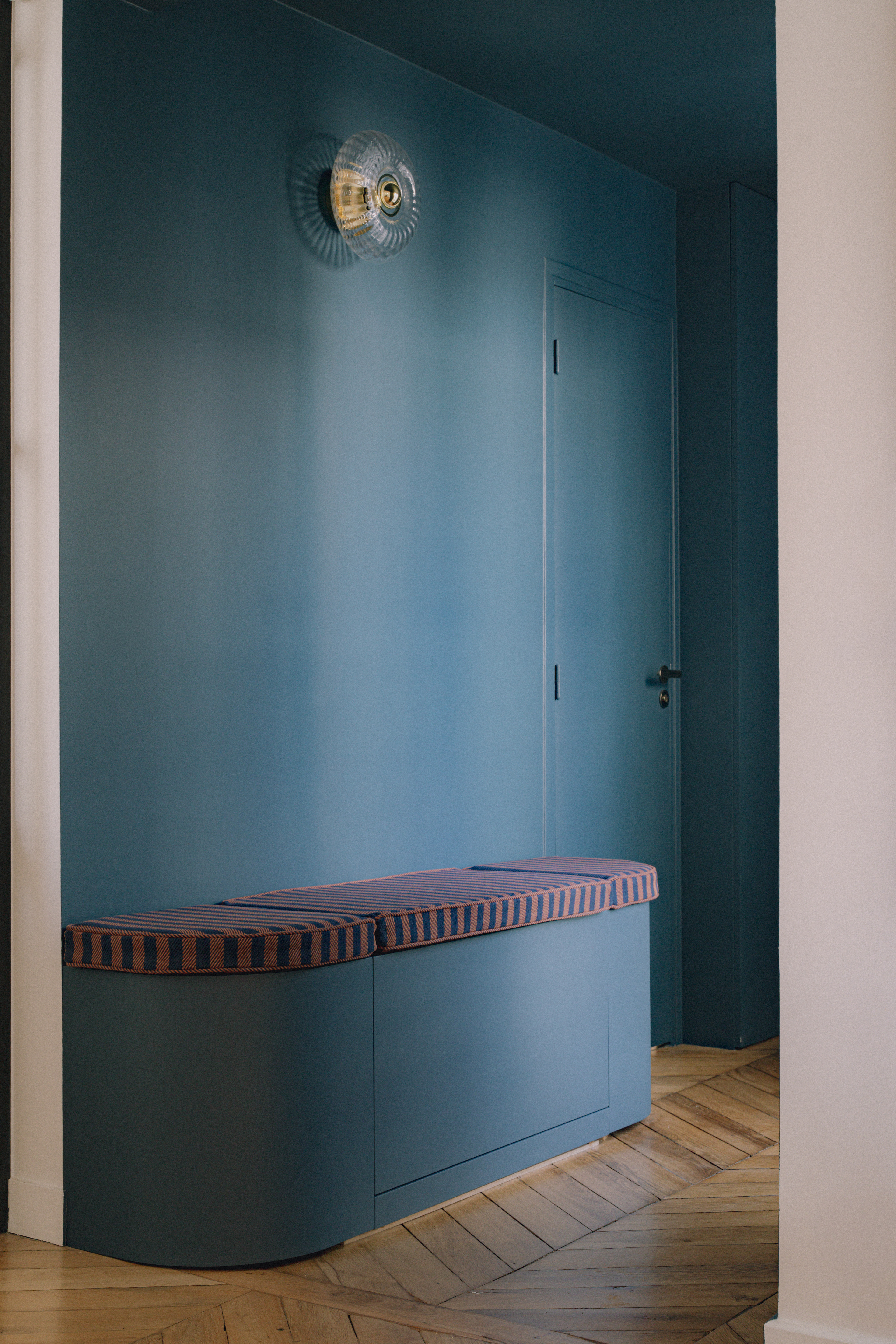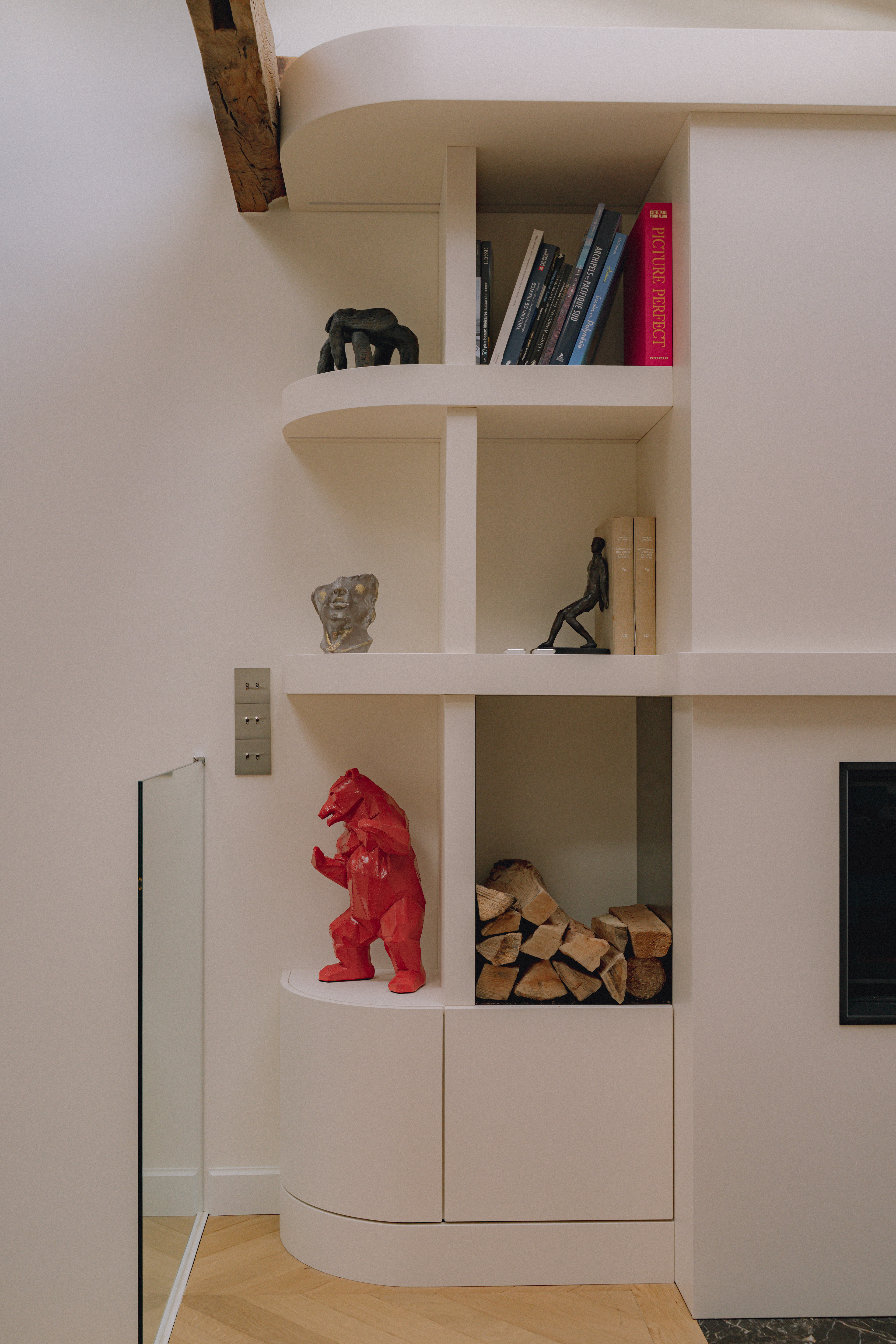 Le mobilier sur mesure, dessiné tout en courbes fluides, apporte douceur et mouvement, et dialogue avec des formes plus graphiques et symétriques comme celles de l’escalier ou des salles de bain. Les dressings toute hauteur, optimisés, prolongent cette recherche d’équilibre en renforçant la verticalité et en accentuant la générosité sous plafond.