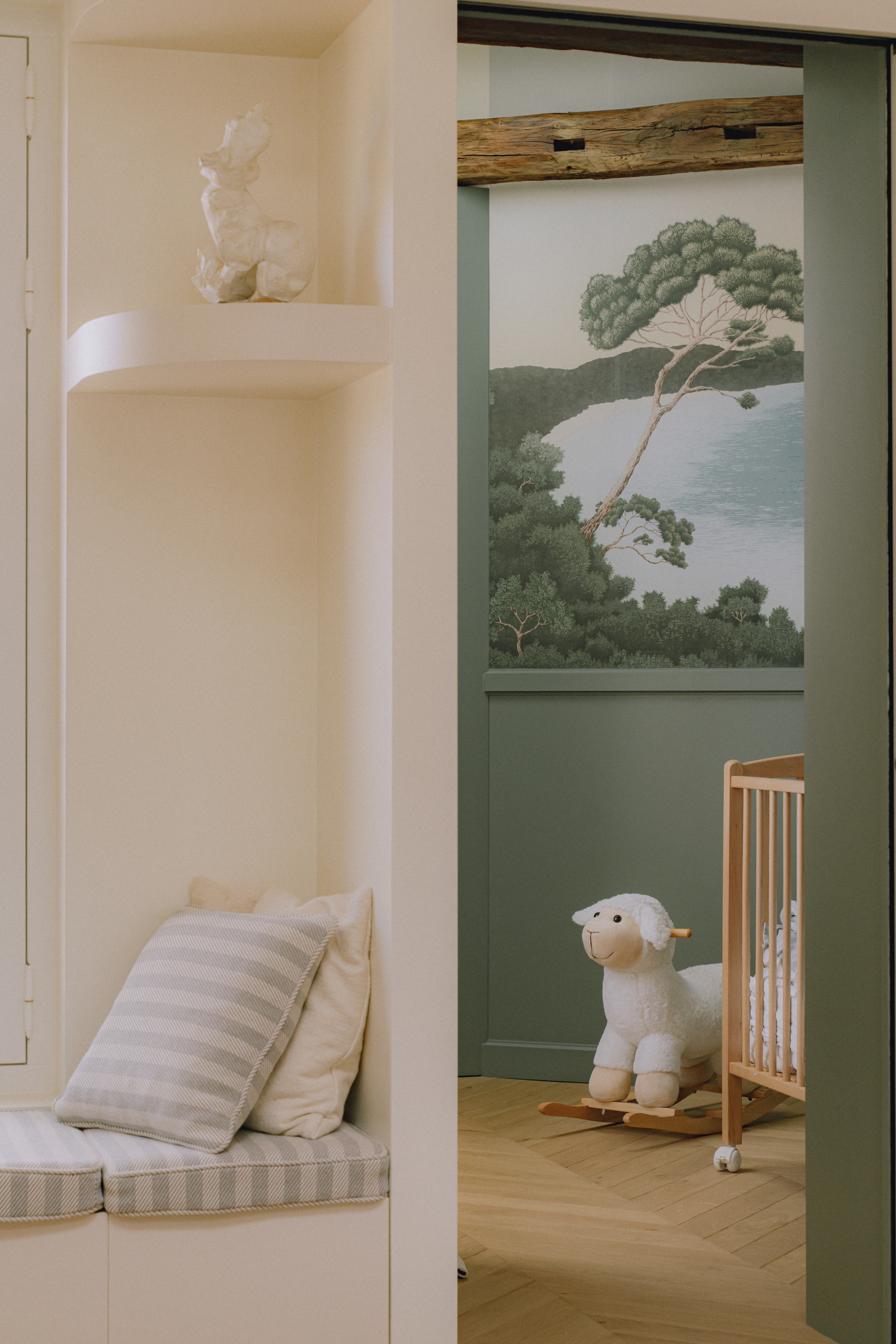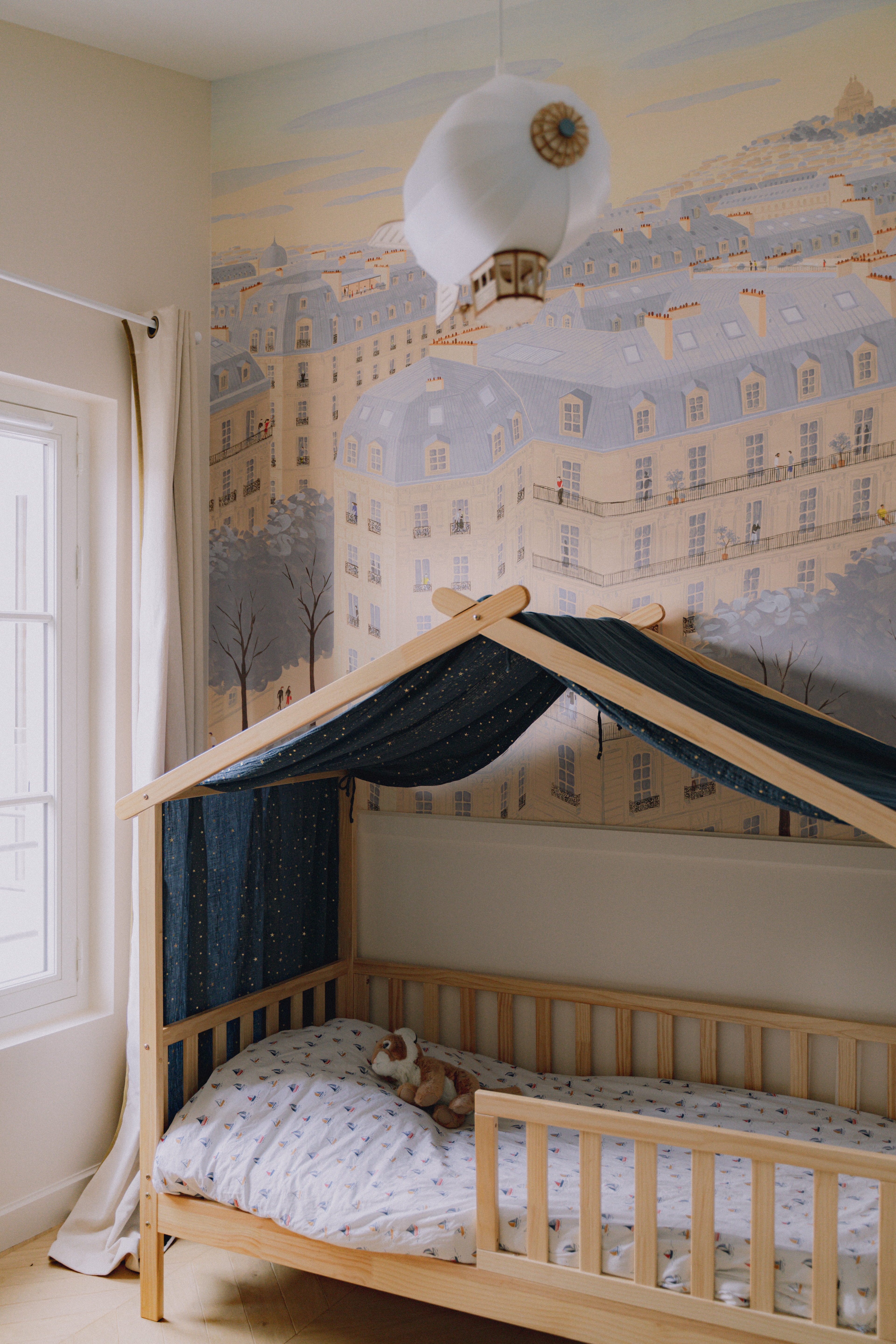 La palette chromatique associe couleurs puissantes et teintes douces : chaque pièce raconte son histoire et dégage une atmosphère singulière. Dans la chambre d’enfant, le thème du ciel et des toits parisiens se déploie à travers un panorama poétique signé Isidore Leroy, au dessus duquel le ballon dirigeable suspendu survole la chambre pour l'éclairer. Le bureau, quant à lui, ouvre une fenêtre sur un panorama végétal et aquatique, également signé Isidore Leroy.